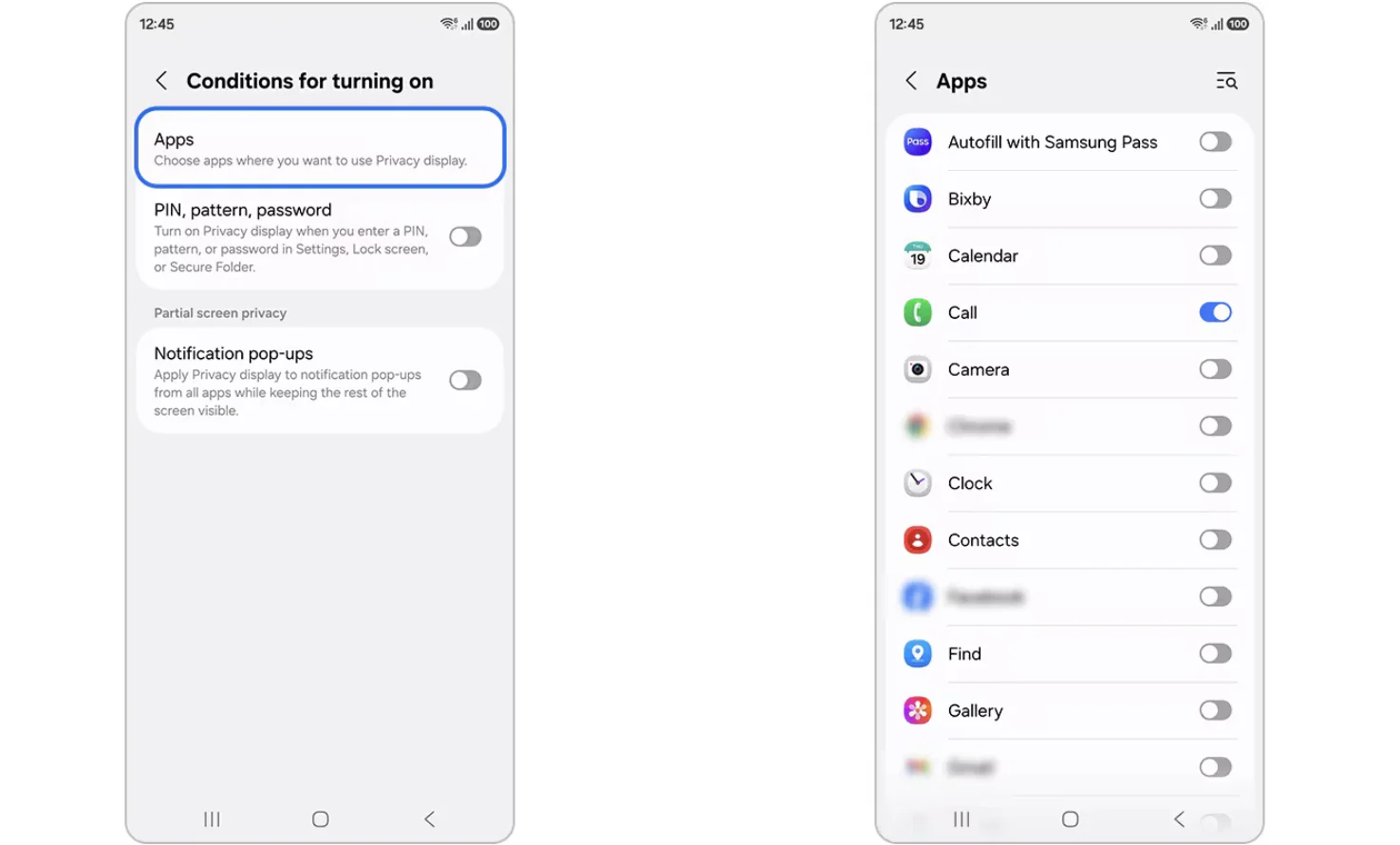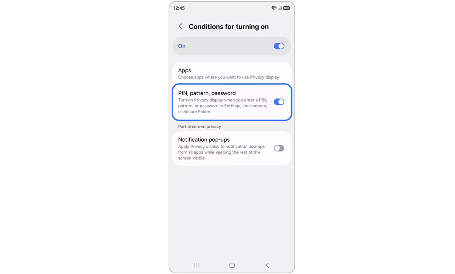 Натисніть, щоб увімкнути PIN, графічний ключ і пароль. Коли це ввімкнено, Privacy Display автоматично застосовується щоразу, коли ви вводите PIN, графічний ключ або пароль у Налаштуваннях, на екрані блокування або в Secure Folder, допомагаючи захищати вашу інформацію від людей поруч.