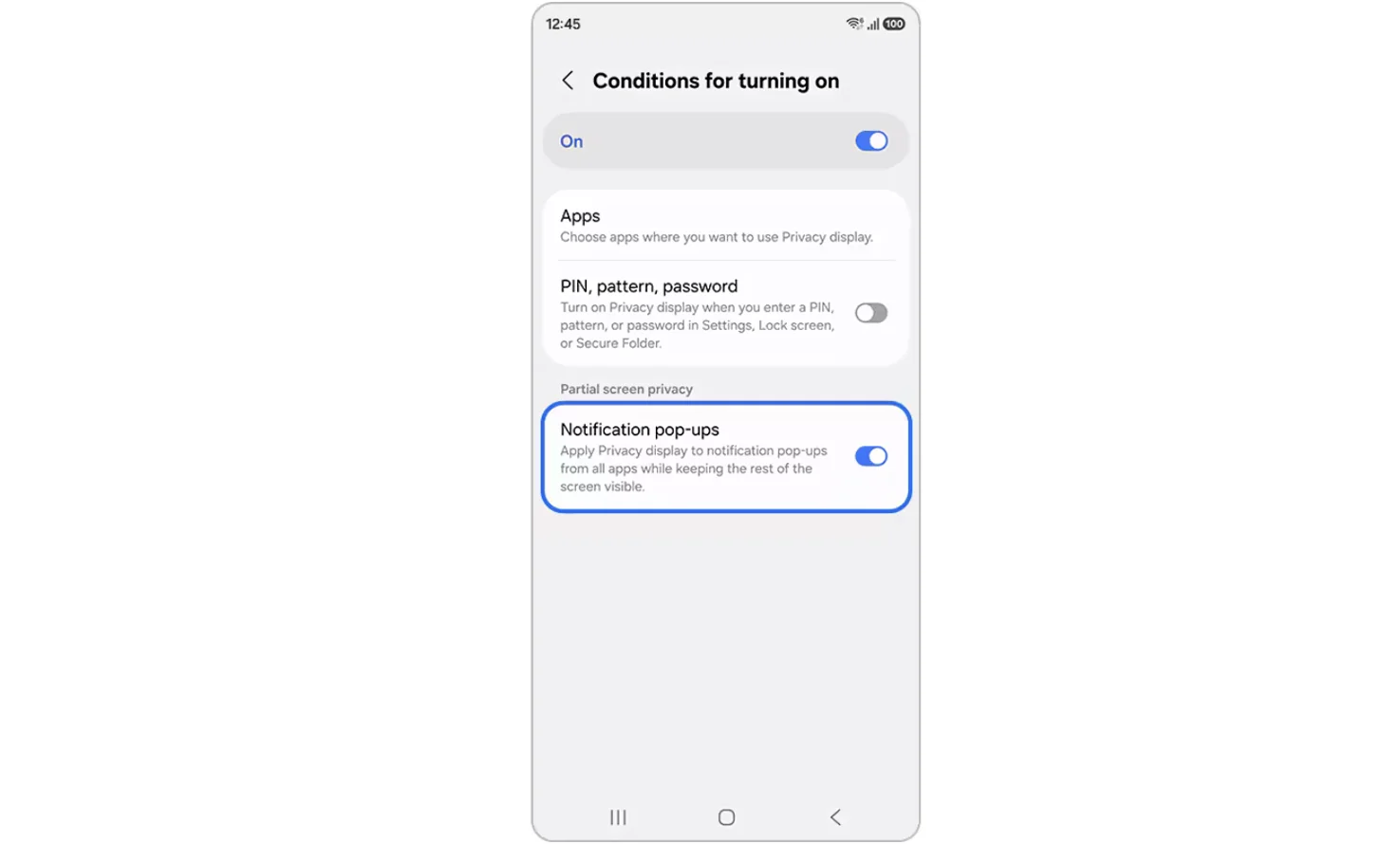 Натисніть, щоб увімкнути Спливні сповіщення. Коли це ввімкнено, Privacy Display застосовується до спливних сповіщень усіх застосунків. Він застосовується лише до області спливного сповіщення і не впливає на інші області екрана. Так ви можете безпечніше переглядати вміст сповіщень у публічних місцях.
