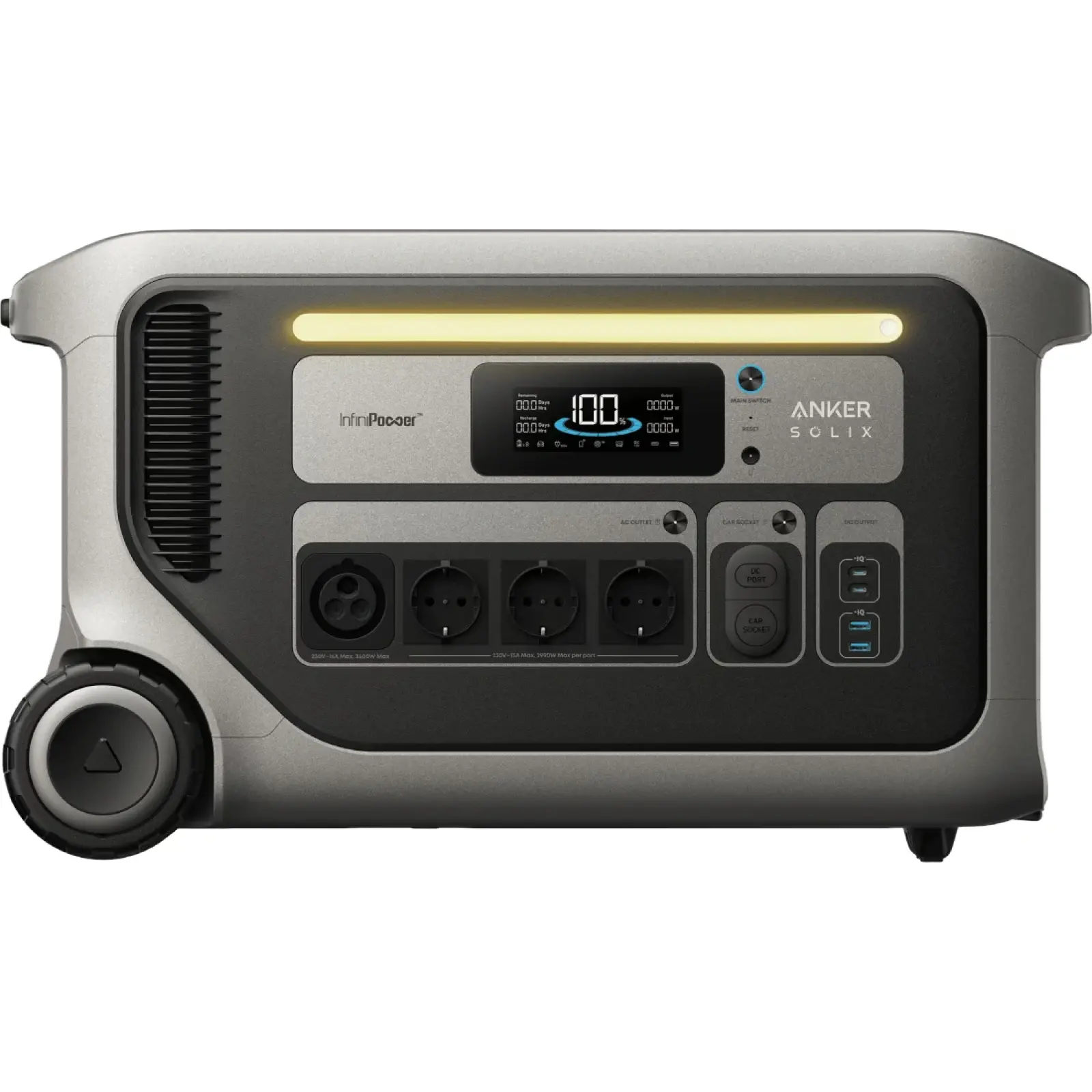 Anker SOLIX F3000 видає 3600 Вт постійної потужності, підтримує SurgePad Power 4860 Вт і пікову стрибкову потужність AC 7200 Вт. На корпусі передбачені розетки NEMA 5-20R, TT-30R, автомобільний вихід 12 В 10 А, порт Anderson 13,4 В 30 А, USB-A до 12 Вт на порт і USB-C до 100 Вт на порт. Така конфігурація дозволяє одночасно працювати з домашніми приладами, технікою для RV і дрібною електронікою.